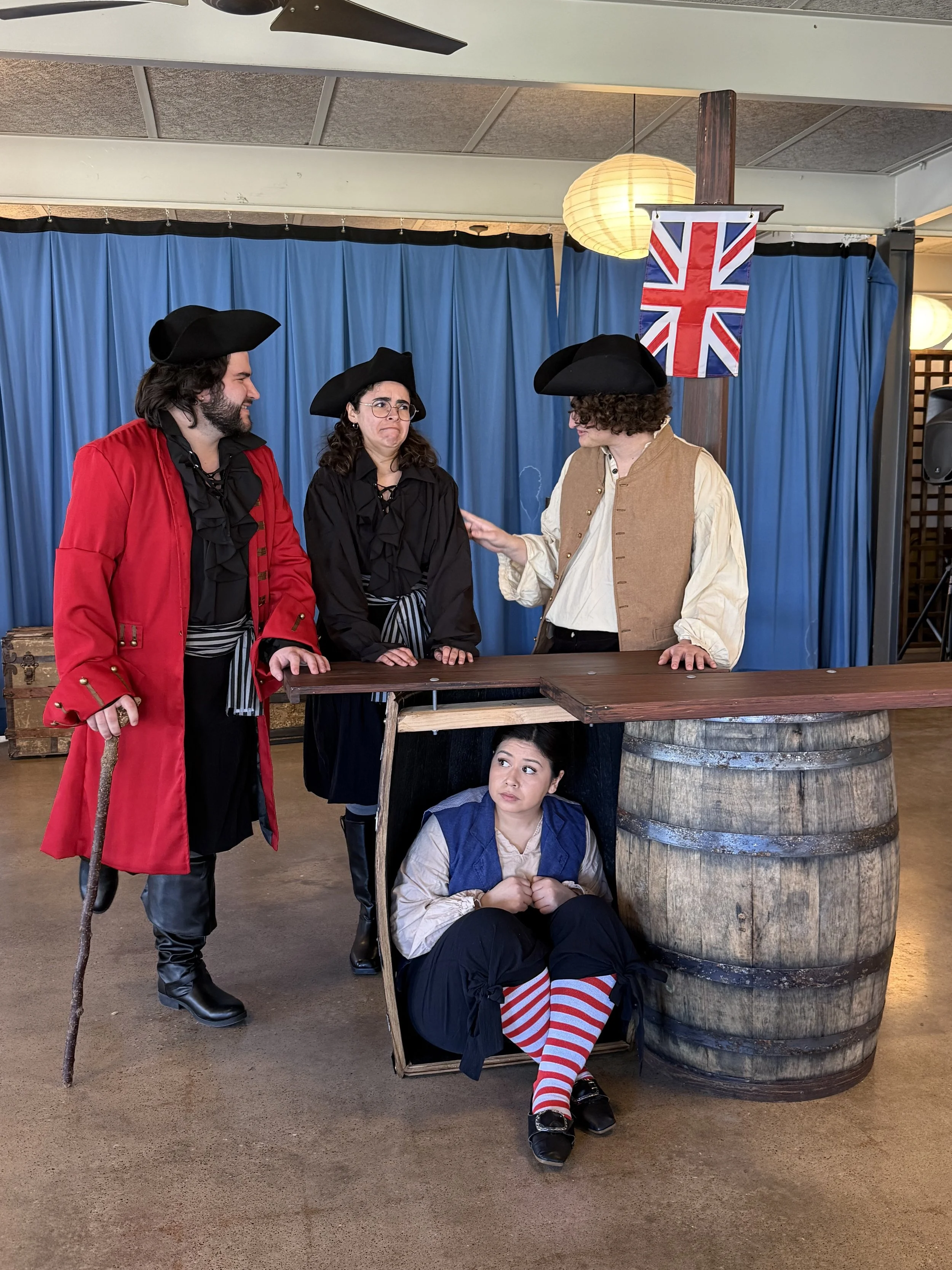 “In order to transform the stage from an Inn to a ship and then to a jungle and a fort, we rely on the audience’s imagination,” Misiewicz says. “As the story moves from one place to another, actors move barrels, masts and crates to create a new setting and the audience uses their imagination to fill in the blanks.”